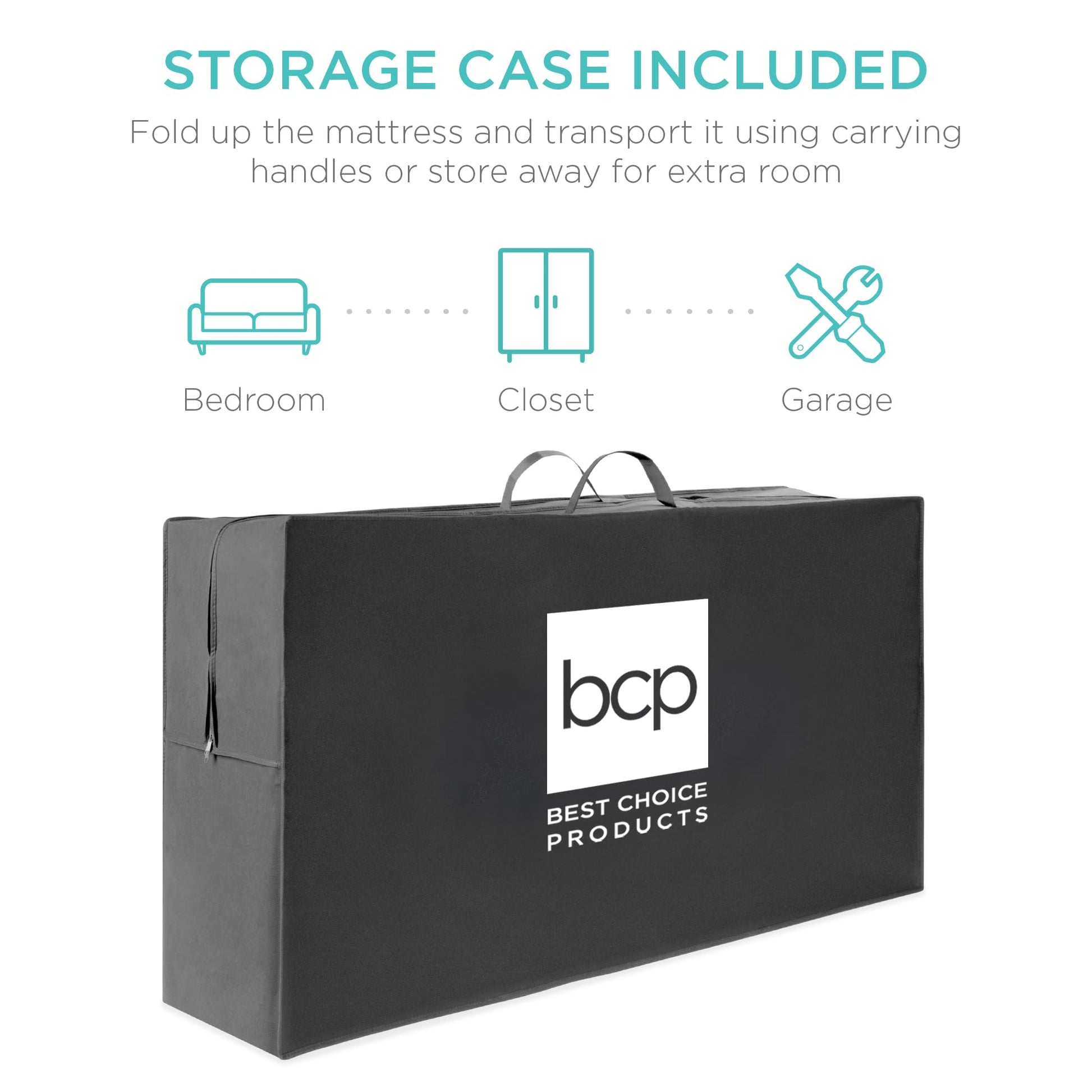 - PORTABLE AND SPACE-SAVING: Simply slip the included carrying case over the portable, tri-fold mattress and zip it up to keep it neat and secure while you travel