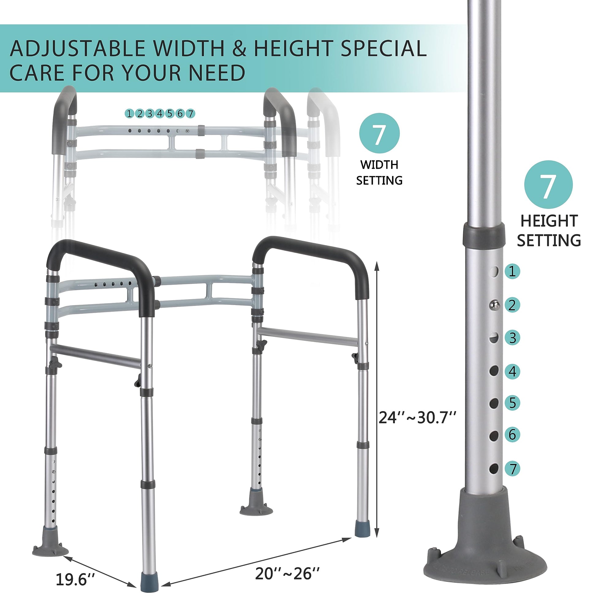 - ADJUSTABLE HEIGHT AND WIDTH: The maximum size of our handicapped toilet rails is 16.15x4.8x13.7 inches, the height of the toilet rails can be adjusted between 24-31 inches, users can adjust it according to their own body shape and height; the width can be adjusted between 20-25 inches, which is suitable for all types of toilets. And our toilet support rails can be folded for easy storage and travel carry.
