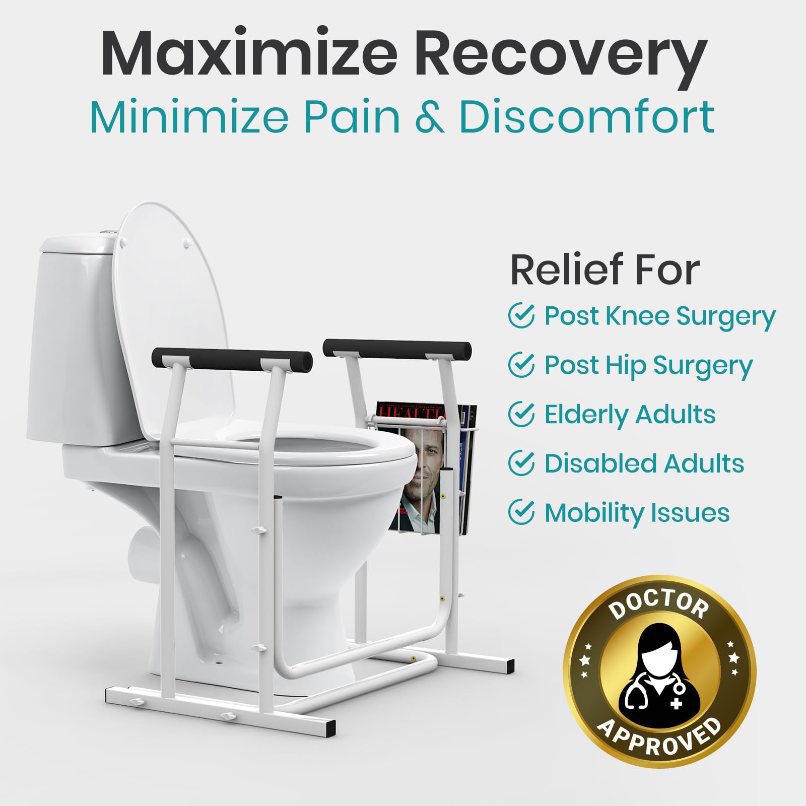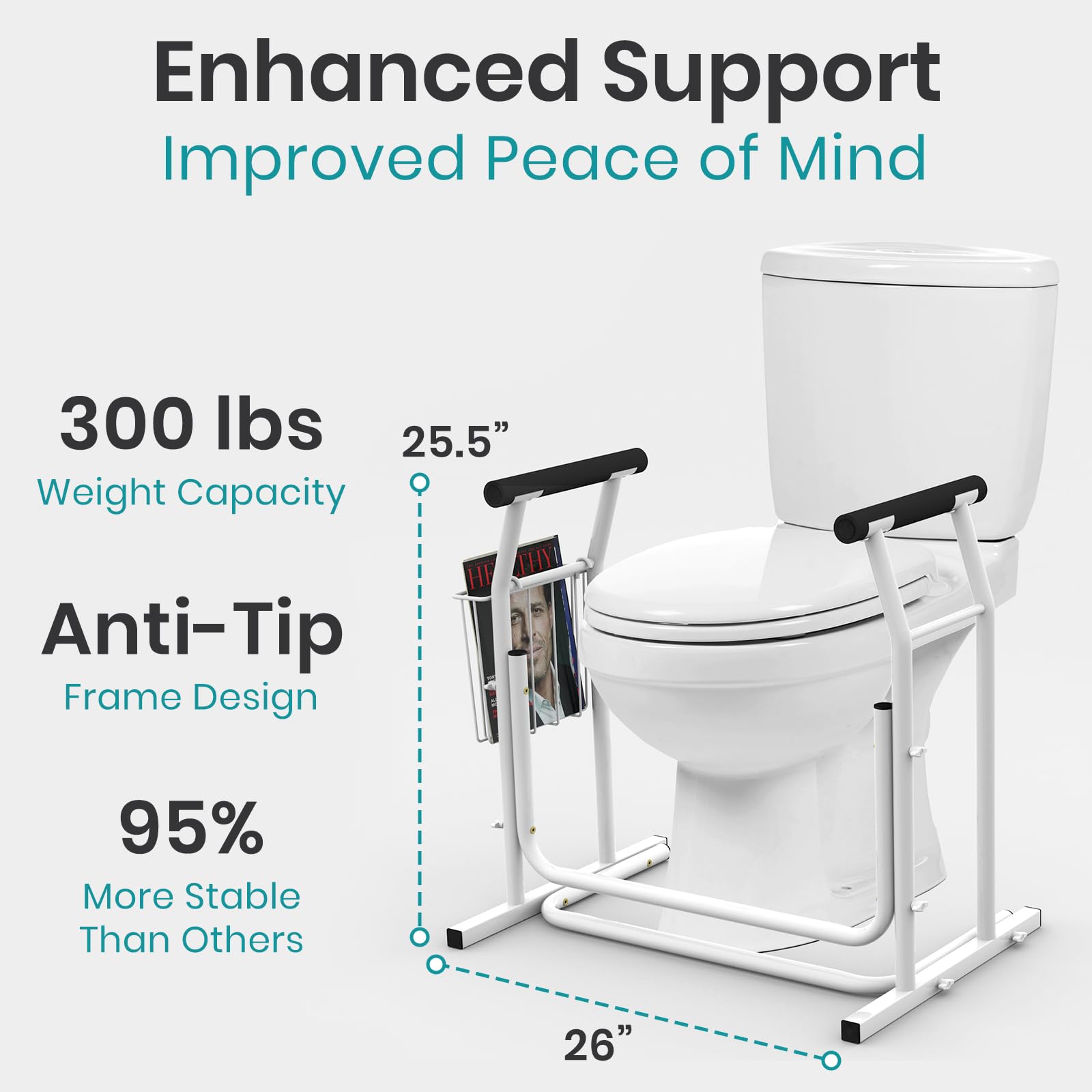- SIT AND STAND SAFELY: Supporting up to 300 pounds, the sturdy, stand alone toilet rail conveniently provides safety and security when sitting down or standing up in the bathroom. Perfect for the elderly, handicapped and for those recovering from injury or surgery, the rail prevents slips and falls for additional peace of mind.